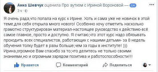 Прошла обучение у доктора Курта Уоллера, основателя американской Академии Интегративной Медицины, специалиста в области биомеда аутизма с 20-летним стажем (Autism Mastery Course).